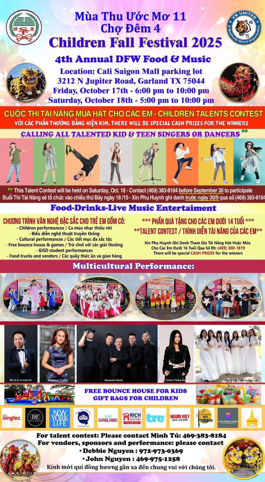 May be an image of 5 people and text that says 'Mùa Thu Ước Mo' 11 Chợ Đêm Children Fall Festival 2025 4th Annual DFW Food Music Location: Cali Saigon Mall parking lot 3212 Jupiter Road, Garland TX 75044 Friday, October 17th 6:00 pm 10:00 pm Saturday, October 18th -5:00 pm 10:00 CUộc MÚA HAT CHO CÁC TALENTS CONTEST CÁC THƯỞNG BẰNG CASH PRIZES FOR THE WINNERS CALLING ALL TALENTED KID TEEN SINGERS OR DANCERS This Talent Saturday, Oct. ngày Contact (469) 383-8184 before September Phụ trước Music participate iDar Gia iaT Hoặc BOUNCE HOUSE FOR CHILDREN GARLAND For talent contest: Please contact sponsors mời •John Nguyen: hương contact chung'